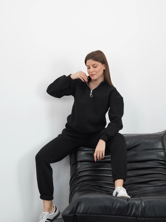 3 iplik içi Şardonlu yarım fermuarlı alt üst takım siyah