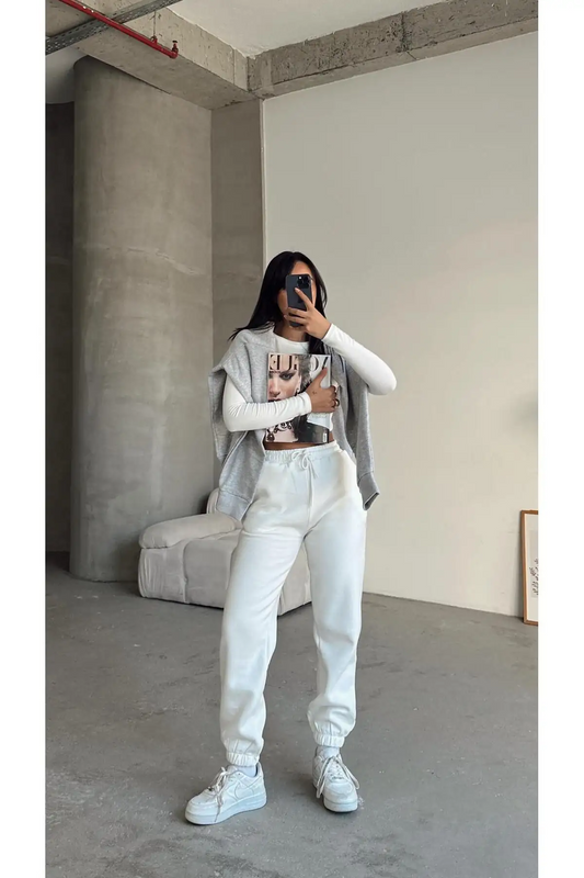 3 iplik şardonlu paça lastikli eşofman beyaz is001
