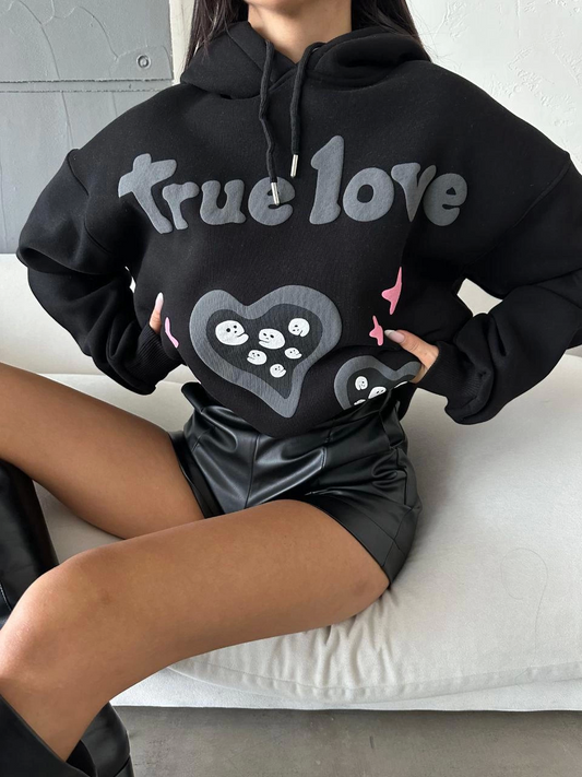 3 iplik şardonlu oversize true baskılı sweat siyah