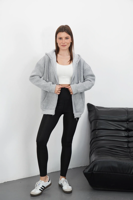 3 iplik şardonlu fermuarlı kapşonlu hırka gri